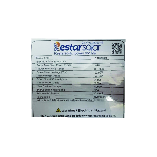 پنل خورشیدی RT040P یکی از پنل های خورشیدی پلی کریستال شرکت Restar است. دارای راندمان بالا مناسب سیستمهای برق خورشیدی، پکیج های برق خورشیدی سیار، چراغهای خورشیدی و …. دارای جعبه اتصال با ولتاژ تحمل و درجه حفاظت بالا، تحمل دمایی بالا منطبق با استانداردهای بینالمللی…